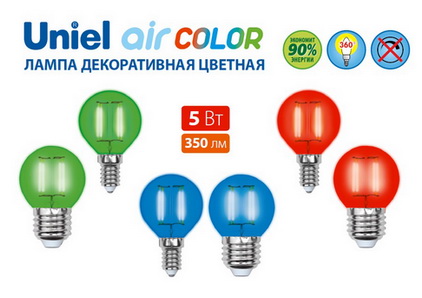 Серия Air color от Uniel — современные декоративные цветные лампы с нитевыми светодиодными излучателями-филаментами, обеспечивающими самый широкий угол излучения в 360°. Лампы серии Air внешне похожи на стандартные лампы накаливания и рекомендуются для общего освещения помещения, а также для использования в декоративных светильниках.
