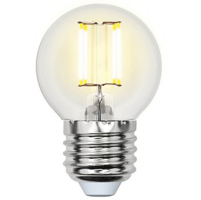 Светодиодная лампочка в форме шара с цоколем E27 и размерами 70 мм по высоте и диаметром в 45 мм обладает мощностью в 6 W, благодаря чему она может осветить 2 кв. м. Цветовая температура – 4000 К, т.е. белый свет, подходящий для рабочего настроя (не рекомендуется для детской комнаты). Ориентировочный срок службы заявленный производителем Uniel составляет 30000 ч.
