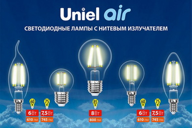 Серия Air от Uniel — современные лампы с нитевыми светодиодными излучателями-филаментами, обеспечивающими самый широкий угол излучения в 360°. Лампы серии Air внешне похожи на стандартные лампы накаливания и рекомендуются для общего освещения помещения, а также для использования в декоративных светильниках.