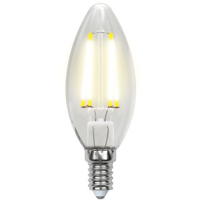 Светодиодная лампочка в форме свечи с цоколем E14 и размерами 100 мм по высоте и диаметром в 35 мм обладает мощностью в 5 W. Цветовая температура – 3000 К, т.е. теплый свет близкий к цвету Солнца. Ориентировочный срок службы заявленный производителем Uniel составляет 30000 ч. Изделие рассчитано на использование в сети с постоянным напряжением в 175-250 В.