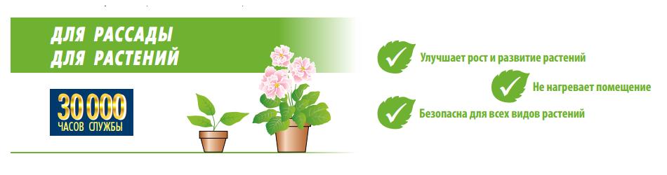 Данная лампа является альтернативой стандартным лампам накаливания и линейным люминесцентным лампам, используемым для дополнительного освещения рассады, а также экзотических комнатных растений.