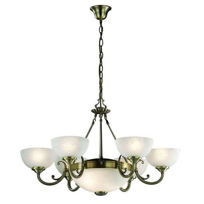 Арматура этой люстры окрашена в бронзовый цвет, придающий светильнику благородный вид. Присутствие в ее оформлении различных декоративных элементов в виде рифлений, завитушек, орнаментов делает светильник особенно красивым и богатым.
