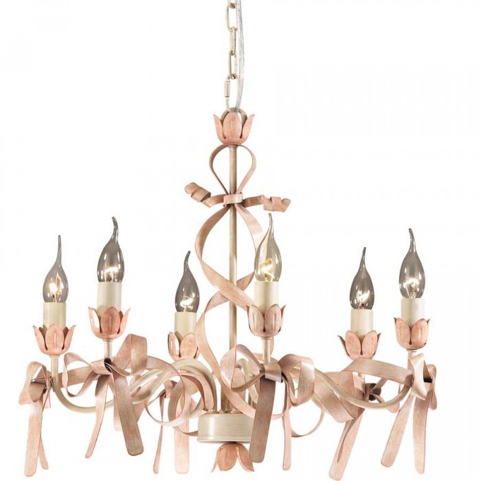 В оформлении модели 2527/6 присутствуют нежно-розовые цветки тюльпанов, искусно изготовленные из тонкого металла. Они играют роль глубоких чаш-подсвечников, поддерживающих источники света. Каждая лампочка-свеча располагается на высоком белом цоколе, напоминающем по форме свечу.