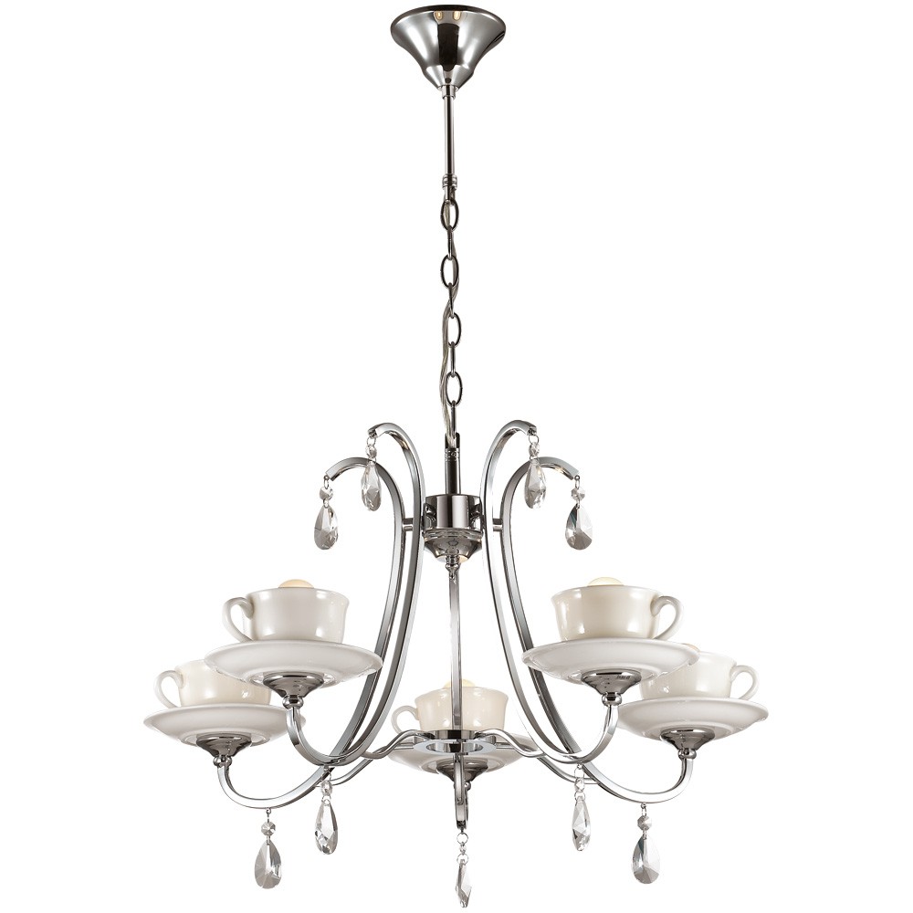 Подвесная люстра 2875/5 Kupa выполнена в соответствии со всеми стандартами качества по последним технологиям производства. Список достоинств данной люстры довольно обширен: высокая функциональность, прекрасный внешний вид, долговечность, высокое качество сборки и прочность материалов изготовления. Дизайн данной модели выполнен в рамках стиля хай-тек, для него характерны продуманность и приятная цветовая гамма. Плафоны выполнены виде чайного сервиза из матового белого стекла, арматура темный хром, декорирована люстра элементами из хрусталя. Мощность светильника также заслуживает всяческих похвал: при использовании лампочек с цоколем 5хE14 она достигает 200 Вт. Благодаря этому, можно создать оптимальную степень освещенности на площади размером до 10 кв.м. К тому же высоту люстры можно регулировать, тем самым меняя площадь освещения.