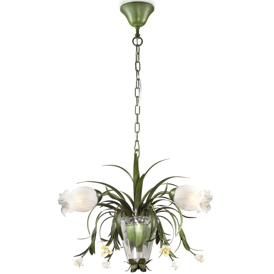 Люстру 2652/3, как и все светильники коллекции Merida, трудно отличить от цветочной композиции, подвешенной к потолку в стеклянном горшочке. Во всяком случае, пока она не включена. Три белых полураскрытых бутона выглядывают из вороха зелени. Вместе с длинными листьями из граненой емкости свисают и более мелкие цветочки, создавая эффект флористической композиции.