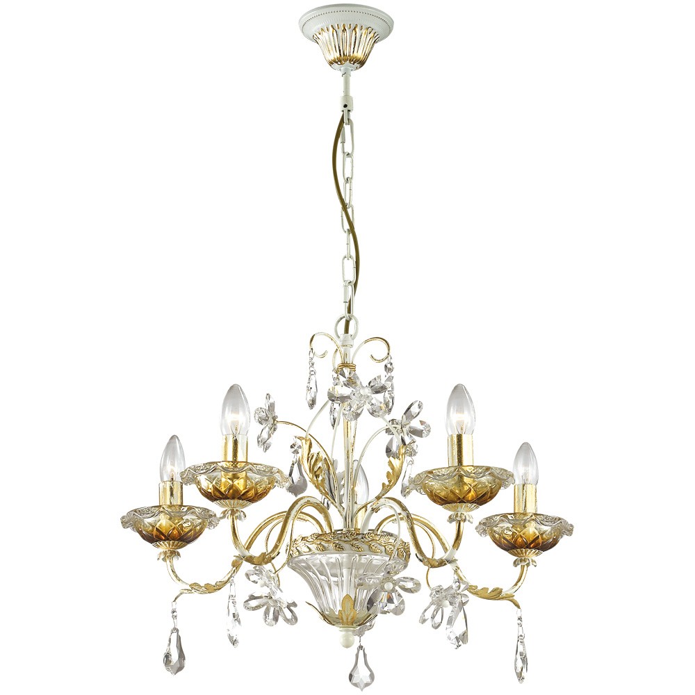 Люстра изготовлена из металла с белым покрытием и золотой патиной. Изящность данной моделе придают декоративные элементы в виде хрустальных цветов, дополнена люстра подвесками из хрусталя. Дизайн данной модели выполнен в рамках стиля классика, для него характерны продуманность и приятная цветовая гамма. Мощность светильника также заслуживает всяческих похвал: при использовании лампочек с цоколем 5хE14 она достигает 300 Вт. Благодаря этому, можно создать оптимальную степень освещенности на площади размером до 15 кв.м. К тому же высоту люстры можно регулировать, тем самым меняя площадь освещения.