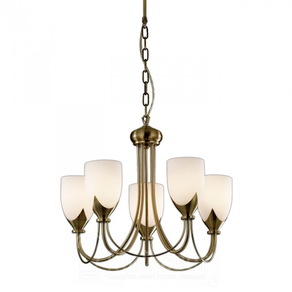 Тонкие прутья арматуры, плавно изгибаясь в нижней части люстры, преподносят роскошные молочно-белые плафоны, грациозные, словно бокалы с дорогим вином. Плафоны обращены лампочками вверх, а их боковые стенки хорошо рассеивают свет, делая освещение мягким и комфортным для глаз. Все металлические элементы светильника окрашены под старинную бронзу, слегка покрытую патиной.