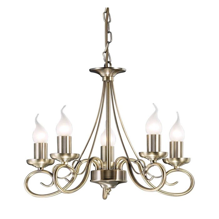 Корпус люстры 1297/5 состоит из тонких прутьев, окрашенных под старинную бронзу. Изящно изогнутые в форме буквы «S» они образуют красивые завитушки, служащие опорой для крепления источников света. По центру люстры от верхней точки крепления до каждого рожка расположились тонкие прутья арматуры, будто-то свободно ниспадающие нити, соединяющие каждый плафон с точкой его крепления.