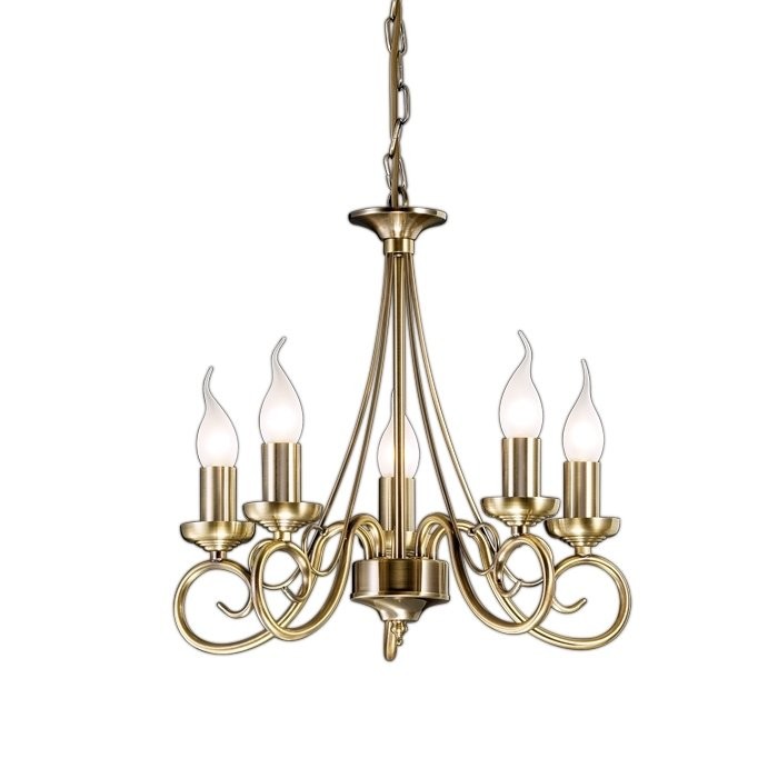 Лампочки в форме пламени свечи, расположенные на подставках, стилизованных под старинные канделябры, эффектно дополняют красивую композицию светильника.