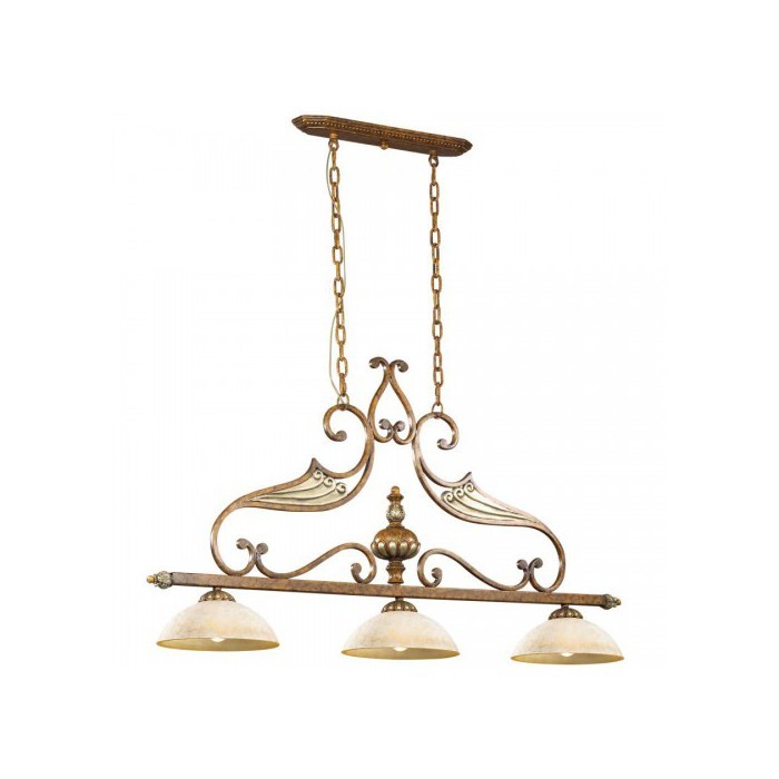 Люстра Odeon 2455/3А имеет нестандартное расположение плафонов – вдоль горизонтальной штанги. Белые с мраморным отливом стеклянные плафоны направлены книзу, обеспечивая максимальное местное освещение. Часть светильника, расположенная над ними, наиболее богата декоративными элементами. Завитушки различных форм, сердечки, миниатюрный купол, украшенный замысловатым орнаментом – все это объединено в единую гармоничную композицию.