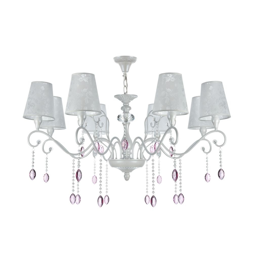 Люстра подвесная FR306-08-W оформлена в стиле прованс и легко сочетается с другими элементами обстановки. Симпатичные тканевые плафоны белого цвета прекрасно смотрятся с белой металлической арматурой. Абажур выполнен из сатина с рисунком, конструкция декорирована хрустальными подвесками. Этот светильник способен создавать освещенную зону площадью в 16 кв. м, поскольку обладает мощностью в 320 Вт. Цоколь лампочек – 8xE14.