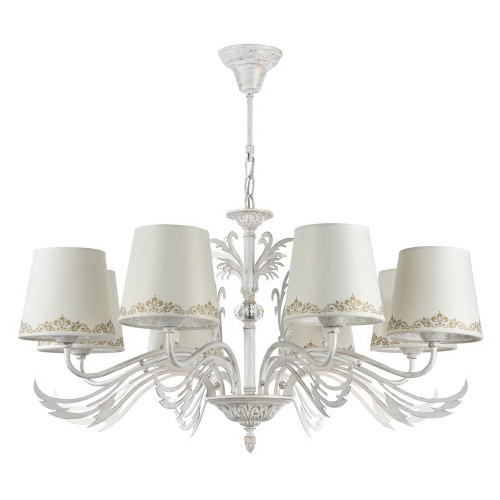 Люстра подвесная Agas FR404-08-GW оформлена в стиле прованс и легко сочетается с другими элементами обстановки. Симпатичные тканевые плафоны белого с бежевым цвета прекрасно смотрятся с белой металлической арматурой. Этот светильник способен создавать освещенную зону площадью в 24 кв. м, поскольку обладает мощностью в 480 Вт. Цоколь лампочек – 8xE14.