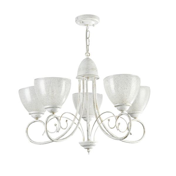 Люстра подвесная Annette FR2753-PL-05-WG оформлена в стиле классика и легко сочетается с другими элементами обстановки. Арматура из металла искусственно состарена, плафоны выполнены из стекла с эффектом "заморозки". Этот светильник способен создавать освещенную зону площадью в 15 кв. м, поскольку обладает мощностью в 300 Вт. Цоколь лампочек – 5xE14.