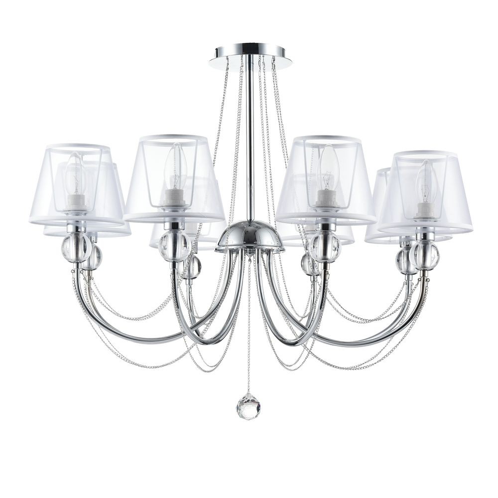 Люстра подвесная с хрустальными подвесками Beverly FR661-08-N имеет эффектный декор, исполненный в стиле арт-деко, и благородную цветовую палитру с использованием хромового и белого оттенков. Светильник рассчитан на освещение площади в 16 кв. м при использовании ламп с цоколем 8xE14 общей мощностью в 320 Вт. Есть возможность подключения диммера, крепление производится на монтажную пластину.