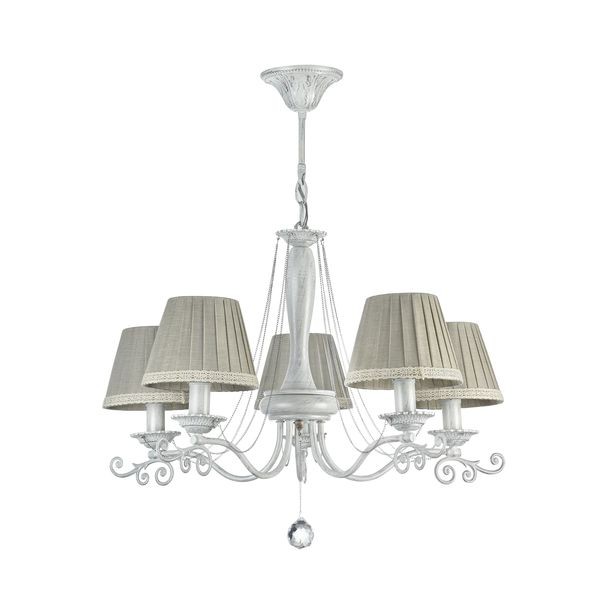 Люстра подвесная Donata FR2759-PL-05-W оформлена в стиле прованс и легко сочетается с другими элементами обстановки. Примечательной деталью стали льняные плафоны, дополненные кружевной тесьмой. Подобные светильники станут прекрасным украшением спальни или кухни. Светильник способен создавать освещенную зону площадью в 10 кв. м, поскольку обладает мощностью в 200 Вт. Цоколь лампочек – 5xE14.