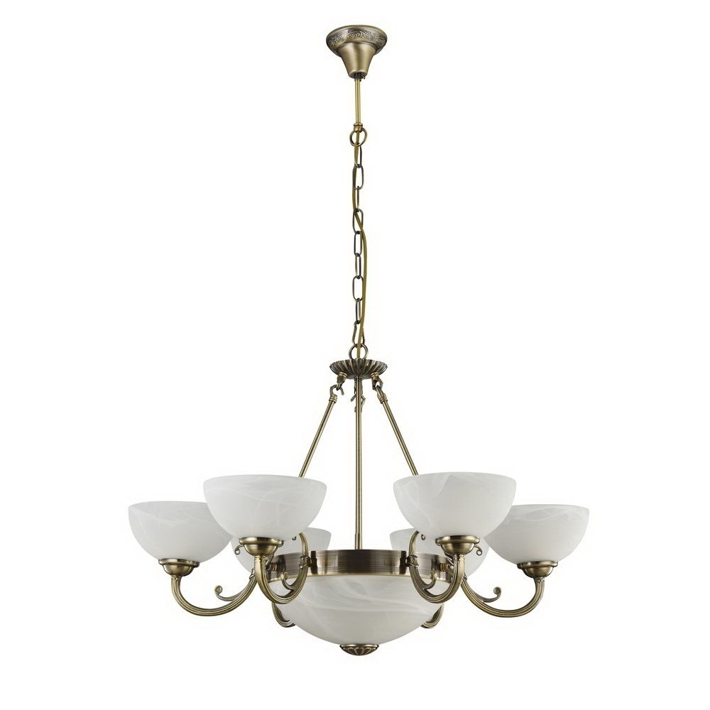 Люстра подвесная FR1012-09-R оформлена в стиле классика, выглядит почти воздушной и легко сочетается с другими элементами обстановки. Симпатичные стеклянные плафоны белого цвета прекрасно смотрятся с бронзовой металлической арматурой. Этот светильник способен создавать освещенную зону площадью в 27 кв. м, поскольку обладает мощностью в 540 Вт. Цоколь лампочек – 9xE27.