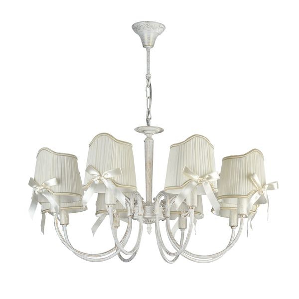 Люстра подвесная Kate FR2749-PL-08-WG оформлена в стиле прованс и легко сочетается с другими элементами обстановки. Небольшие бантики на текстильных абажурах, выполненные из атласной тесьмы, - дань популярному стилю "шебби шик". Этот светильник способен создавать освещенную зону площадью в 16 кв. м, поскольку обладает мощностью в 320 Вт. Цоколь лампочек – 8xE14.