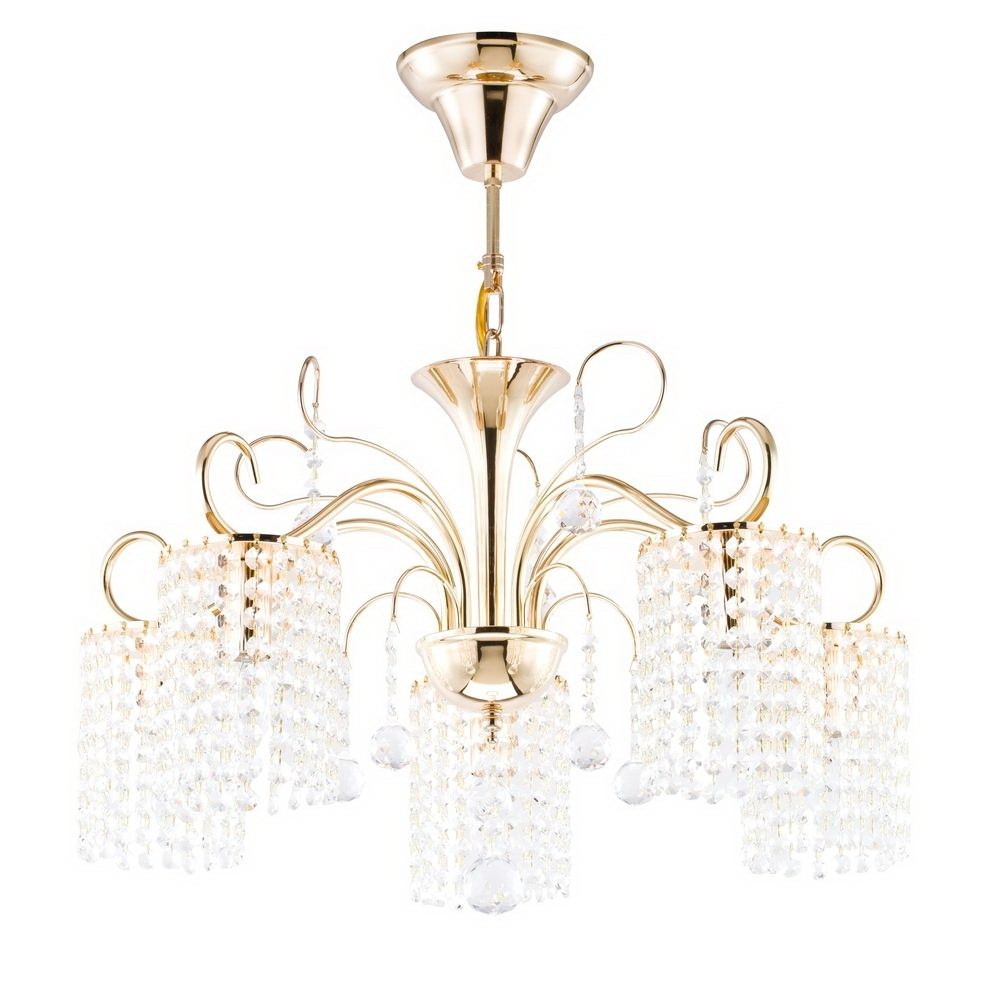 Люстра подвесная FR127-05-G оформлена в стиле арт-деко, выглядит почти воздушной и легко сочетается с другими элементами обстановки. Симпатичные стеклянные плафоны прозрачного цвета прекрасно смотрятся с золотой металлической арматурой. Этот светильник способен создавать освещенную зону площадью в 10 кв. м, поскольку обладает мощностью в 200 Вт. Цоколь лампочек – 5xE14.