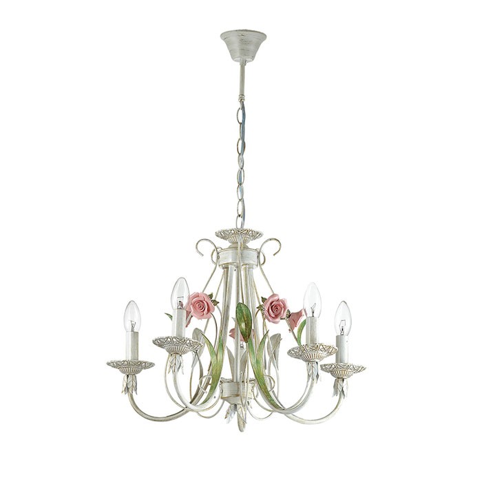 Люстра подвесная 3112/5 серии Clarissa оформлена в стиле прованс. Люстра состоит из арматуры белого с золотой патиной цвета, украшенной керамическими розочками и ажурными блюдцами под лампу-свечку. Нежные цветочные оттенки данной модели создадут атмосферу первозданного единения с природой. Необходимо использовать лампы с цоколем E14. Мощность 5x40W позволяет освещать территорию площадью до 10 кв. м ровным, приятным светом.