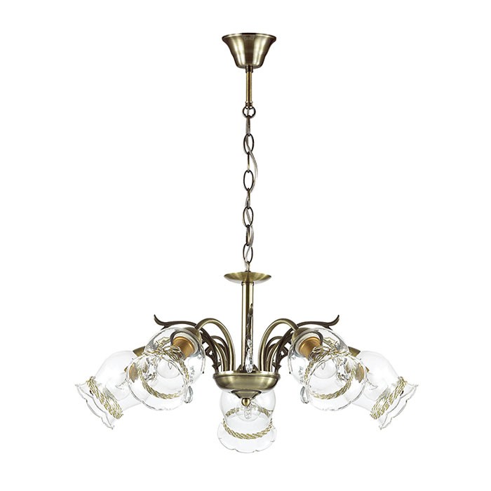 Люстра подвесная 3094/5 серии Divina оформлена в ретро стиле. Светильник состоит из стеклянных плафонов с металлической окантовкой и арматуры бронзового цвета, украшенной хрусталем. Данная модель станет прекрасным решением для кухни или небольшой гостиной. Необходимо использовать лампы с цоколем E14. Мощность 6x60W позволяет освещать территорию площадью до 18 кв. м ровным, приятным светом.