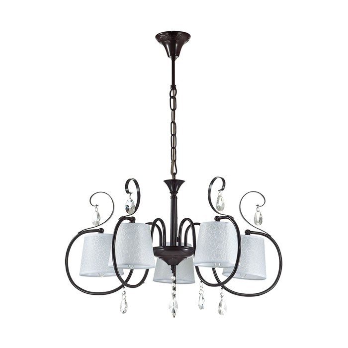 Люстра подвесная 3077/5 серии Ibbi оформлена в современном стиле.Люстра состоит из белых тканевых абажуров и черной арматуры необычной формы, украшенной хрустальными элементами. Актуальное и стильное сочетание черного и белого и оригинальность формы привнесут элегантный лоск в ваш дом. Необходимо использовать лампы с цоколем Е14. Мощность 5x40W позволяет освещать территорию площадью до 10 кв. м ровным, приятным светом.