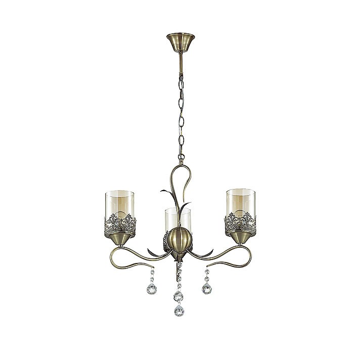 Люстра подвесная 3097/3 серии Mirela оформлена в стиле прованс. Люстра состоит из прозрачных стеклянных плафонов с кружевным металлическим декором и арматуры классического бронзового цвета, украшенной хрустальными подвесками. Сочетание нежных кружевных декоративных элементов и классического цветового решения придает данной модели строгую изысканность. Необходимо использовать лампы с цоколем E14. Мощность 3x40W позволяет освещать территорию площадью до 6 кв. м ровным, приятным светом.