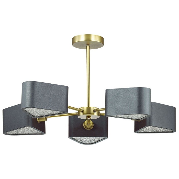Плафоны люстры Lumion Riven имеют форму правильного треугольника и дополнены декоративными стеклянными рассеивателями, украшенными стеклянной крошкой. Дополняет образ лаконичная форма основания цвета античная бронза.