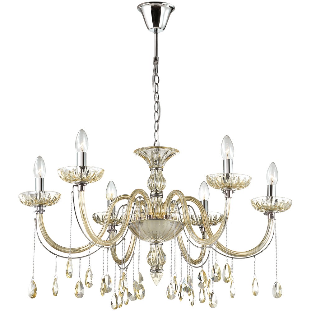 Люстра 2911/6 серии Alvada выполнена в классическом стиле. Покрытие люстры цвета хром, рожки декорированы янтарным стеклом и подвесками из хрусталя. Мощность светильника также заслуживает всяческих похвал: при использовании лампочек с цоколем 6хE14 она достигает 240 Вт. Благодаря этому, можно создать оптимальную степень освещенности на площади размером до 12 кв.м. К тому же высоту люстры можно регулировать, тем самым меняя площадь освещения.