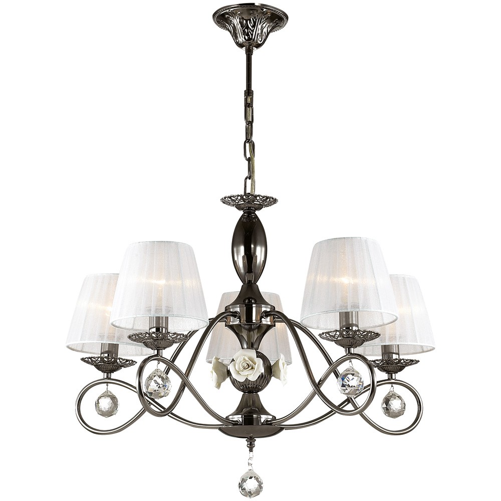 Люстра 2933/5 серии Bresano выполнена в цвете темный хром. Абажур из светлой органзы, декоративные элементы в виде керамической розы и хрустальных подвесок. Мощность светильника также заслуживает всяческих похвал: при использовании лампочек с цоколем 5хE14 она достигает 200 Вт. Благодаря этому, можно создать оптимальную степень освещенности на площади размером до 10 кв.м. К тому же высоту люстры можно регулировать, тем самым меняя площадь освещения.