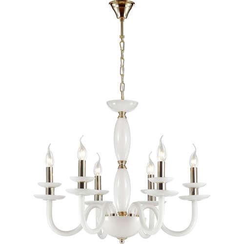 В основе подвеса Capri 4187/6 лежит элегантная белая люстра на 6 рожков с белыми подсвечниками. Центральная часть состоит из штанги скрытой элегантными элементами из белого стекла в виде вазы и нижней чаши. В осветительном приборе рожки выполнены из белого выдувного стекла с двойными белыми чашечками для подсвечников. Центральная ваза имеет золотой поясок, как будто утягивающий и делающий ее стройнее. Все это изумительно сочетается и представляет собой отличный вариант для украшения своего интерьера. Цвет арматуры золото.