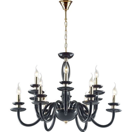 В основе подвеса Capri 4188/12 лежит элегантная черная люстра на 12 рожков с черными подсвечниками. Центральная часть состоит из штанги скрытой элегантными элементами из черного стекла в виде вазы и нижней чаши. В осветительном приборе рожки выполнены из черного выдувного стекла с двойными черными чашечками для подсвечников. Центральная ваза имеет золотой поясок, как будто утягивающий и делающий ее стройнее. Все это изумительно сочетается и представляет собой отличный вариант для украшения своего интерьера. Цвет арматуры золото.