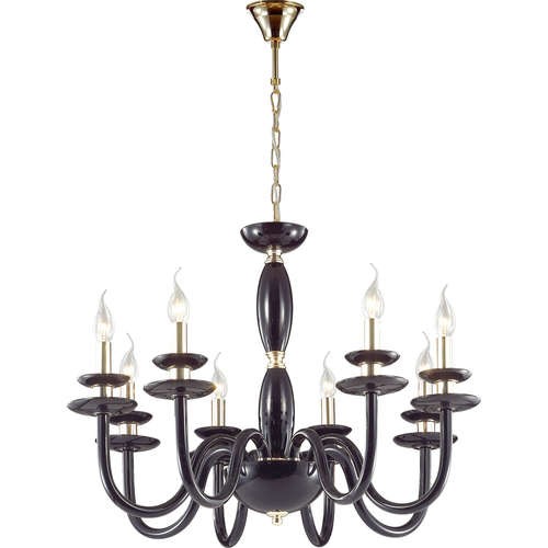 В основе подвеса Capri 4188/8 лежит элегантная черная люстра на 8 рожков с черными подсвечниками. Центральная часть состоит из штанги скрытой элегантными элементами из черного стекла в виде вазы и нижней чаши. В осветительном приборе рожки выполнены из черного выдувного стекла с двойными черными чашечками для подсвечников. Центральная ваза имеет золотой поясок, как будто утягивающий и делающий ее стройнее. Все это изумительно сочетается и представляет собой отличный вариант для украшения своего интерьера. Цвет арматуры золото.