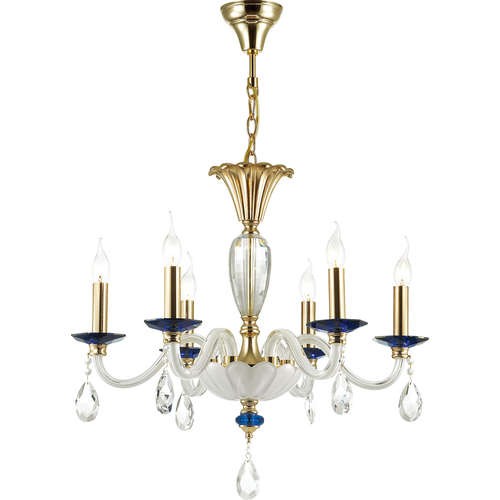 В основе светильника Elefi 4600/6 лежит классический подвес со свечами. Основная часть светильника выполнена в белом стекле с металлическими элементами, эффектно дополняющих друг друга. Центральная штанга скрыта декоративными стеклянными элементом из прозрачного стекла, а изогнутые рожки из выдувного белого стекла создают интересный невесомый эффект в интерьере. Нижняя часть скрыта красивой стеклянной полусферой, со стильным подвесным хрустальным шариком. Золотые подсвечники поддерживаются красивыми синими чашечками. Цвет арматуры золотой.