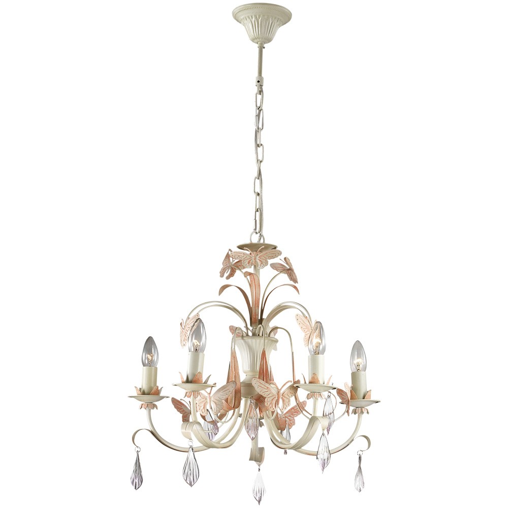 Люстра 2895/5 серии Fera выполнена в кремовом цвете. Изящный, воздушный декор в виде металлическим бабочек, хрустальные подвески по периметру. Мощность светильника также заслуживает всяческих похвал: при использовании лампочек с цоколем 5хE14 она достигает 300 Вт. Благодаря этому, можно создать оптимальную степень освещенности на площади размером до 15 кв.м. К тому же высоту люстры можно регулировать, тем самым меняя площадь освещения.