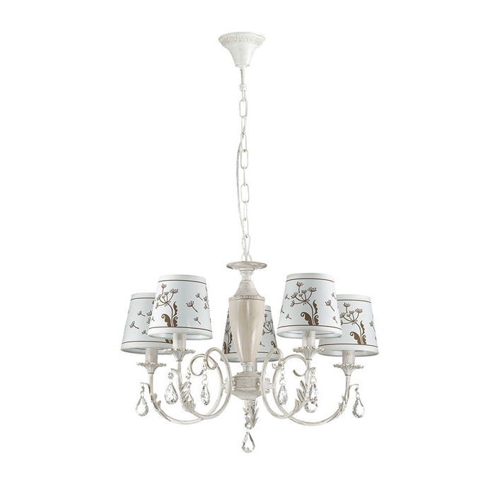 Люстра 3219/5 серии Gabinna оформлена в классическом стиле. Люстра состоит из арматуры белого с золотой патиной цвета с хрустальными подвесками и деревянным декоративным элементом и пастельных тканевых абажуров с цветочным рисунком. Данная модель станет прекрасным дополнением Вашему стильному интерьеру.