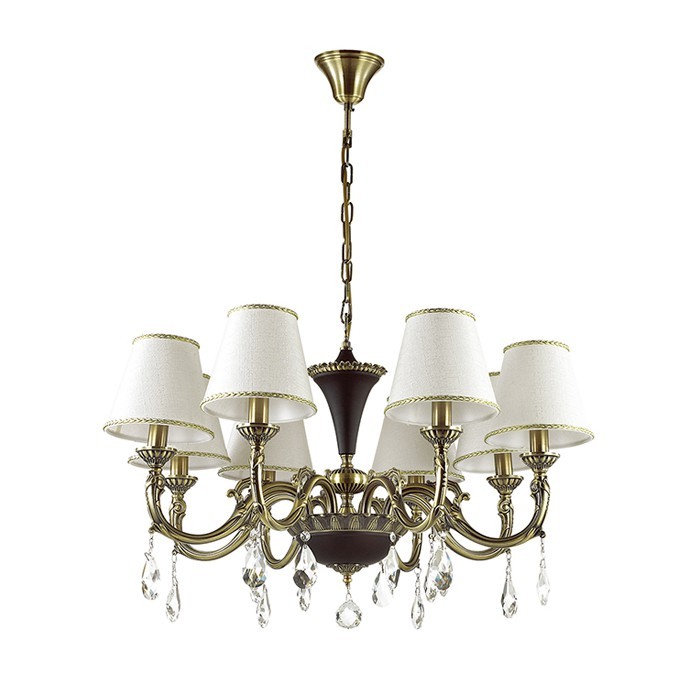 Подвесная люстра с хрусталем Luiza 3417/8, рассчитанная на освещение площади в 16 кв. м. Стильный декор с использованием черт в стиле классика позволяет устройству быть эффектным аксессуаром, а не просто источником света. Подразумевается использование лампочек с цоколем 8xE14 и общей мощностью в 320 Вт. Для изготовления прибора использованы: металл – для корпуса, ткань – для плафона. Светильник крепится на металлический крюк и может подключаться к диммеру для более плавной регулировки света.