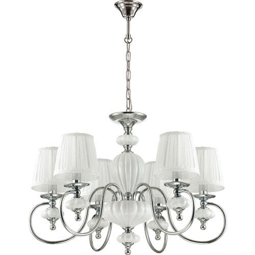 В основе подвеса Medea 4186/6 лежит элегантная белая люстра на 6 рожков в классическом стиле. Арматура состоит из двух материалов металл и керамика. Керамические элементы белого цвета украшают центральную часть люстры и каждый подсвечник. Рожки выполнены из металла хромового цвета, которые украшают белые плафоны из плиссированной ткани. Люстра получилась очень стильной и лаконичной, с идеальным сочетание белой керамики и хрома. Все это изумительно сочетается и представляет собой отличный вариант для украшения своего интерьера. Цвет арматуры хром.