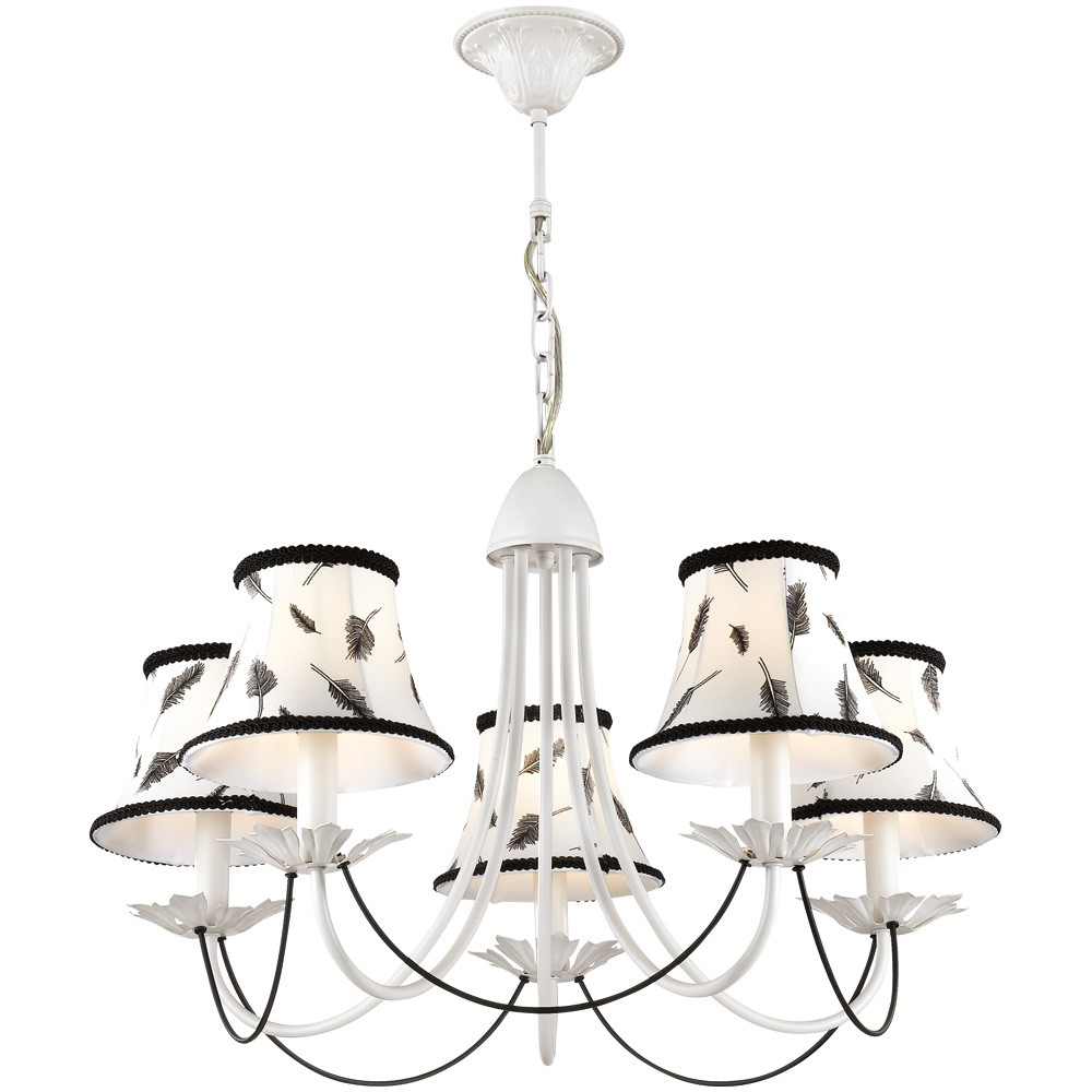 Люстра 2920/5 серии Novola выполнена в белом цвете. Светлый тканевый абажур декорирован рисунком из черных перьер, декоративные элементы выполнены в виде металлических лепестков. Дизайн данной модели выполнен в рамках стиля модерн, для него характерны продуманность и приятная цветовая гамма. Мощность светильника также заслуживает всяческих похвал: при использовании лампочек с цоколем 5хE14 она достигает 200 Вт. Благодаря этому, можно создать оптимальную степень освещенности на площади размером до 10 кв.м. К тому же высоту люстры можно регулировать, тем самым меняя площадь освещения.