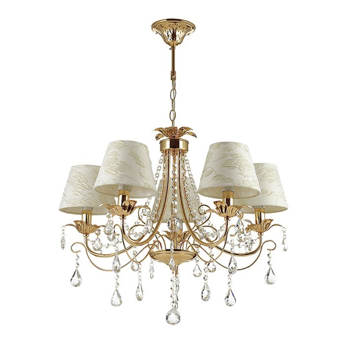 Подвесная люстра с хрусталем Plesansa 3431/5, рассчитанная на освещение площади в 10 кв. м. Стильный декор с использованием черт в стиле классика позволяет устройству быть эффектным аксессуаром, а не просто источником света. Подразумевается использование лампочек с цоколем 5xE14 и общей мощностью в 200 Вт. Для изготовления прибора использованы: металл – для корпуса, ткань – для плафона. Светильник крепится на металлический крюк и может подключаться к диммеру для более плавной регулировки света.