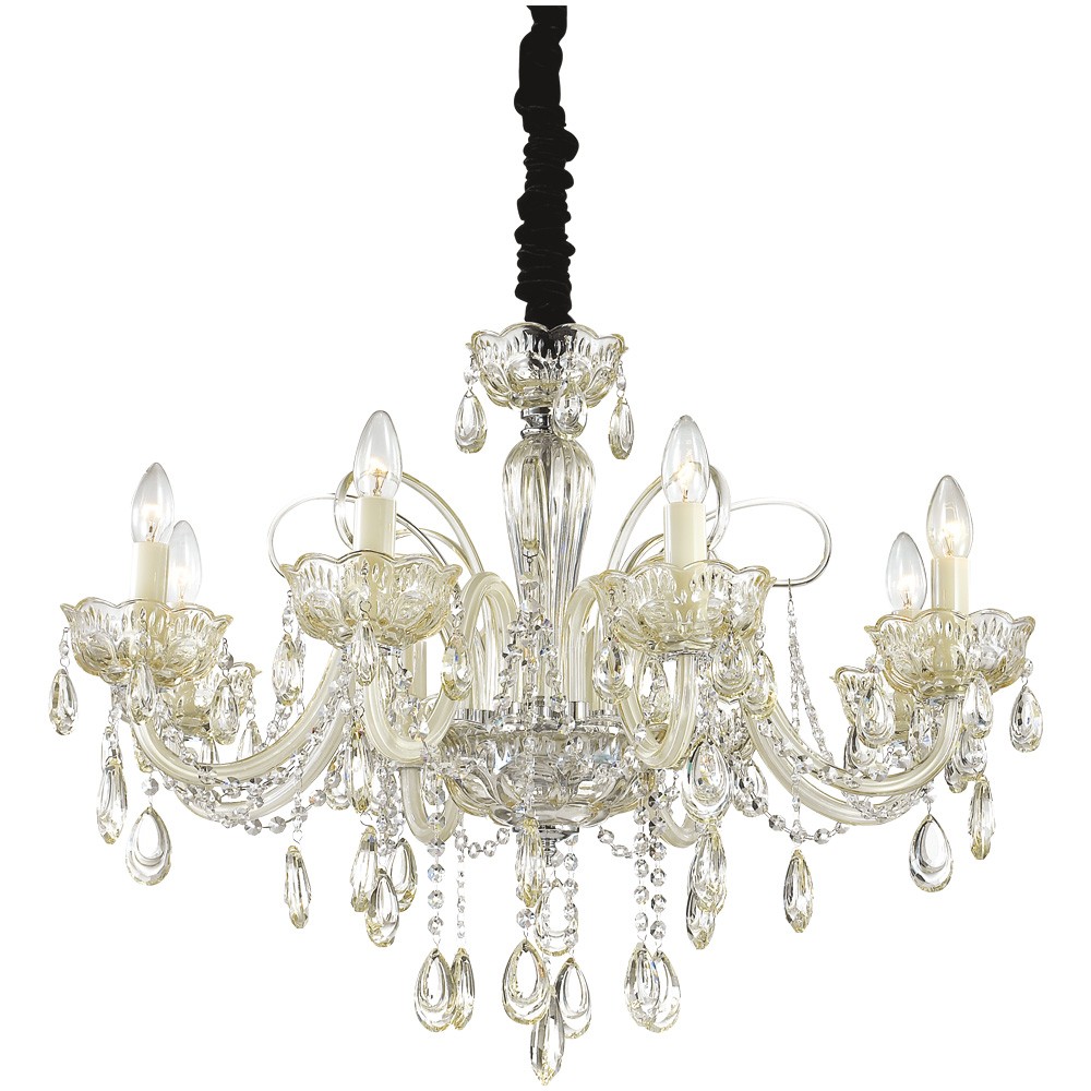 Люстра 2938/8 серии Remena оформлена в классическом стиле. Вензеля из бежевого стекла и множество хрустальных подвесок придают данной модели роскошь исполнения, цвет покрытия базы хром. Мощность светильника также заслуживает всяческих похвал: при использовании лампочек с цоколем 8хE14 она достигает 320 Вт. Благодаря этому, можно создать оптимальную степень освещенности на площади размером до 16 кв.м. К тому же высоту люстры можно регулировать, тем самым меняя площадь освещения.