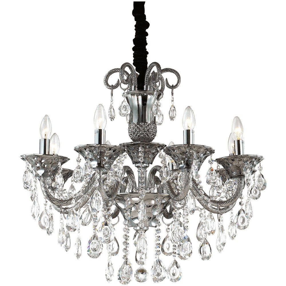 Люстра 2940/8 серии Valensa оформлена в классическом стиле. Вензеля из темно-серого стекла и множество хрустальных подвесок придают данной модели роскошь исполнения, цвет покрытия базы хром. Мощность светильника также заслуживает всяческих похвал: при использовании лампочек с цоколем 8хE14 она достигает 320 Вт. Благодаря этому, можно создать оптимальную степень освещенности на площади размером до 16 кв.м. К тому же высоту люстры можно регулировать, тем самым меняя площадь освещения.