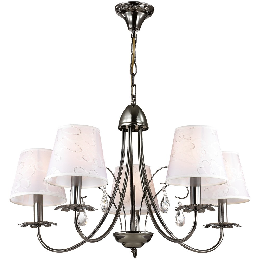 Люстра 2919/5 серии Vetera выполнена в цвете темный хром. Светлый тканевый абажур люстры украшен ажурным рисунком, декоративные элементы выполнены в виде хрустальных подвесок. Дизайн данной модели выполнен в рамках стиля модерн, для него характерны продуманность и приятная цветовая гамма. Мощность светильника также заслуживает всяческих похвал: при использовании лампочек с цоколем 5хE14 она достигает 200 Вт. Благодаря этому, можно создать оптимальную степень освещенности на площади размером до 10 кв.м. К тому же высоту люстры можно регулировать, тем самым меняя площадь освещения.