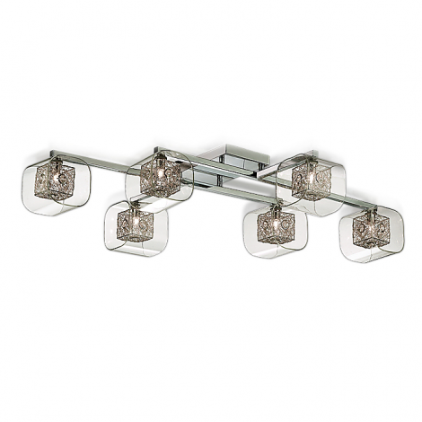Плафоны люстры, расположенные на концах хромированной арматуры, необычны и эффектны. Они состоят из двух элементов – внешней прозрачной стеклянной оболочки и внутреннего ажурного куба, выполненного плетением тончайшей хромированной проволоки. Каждая плоскость куба инкрустирована роскошным большим кристаллом, расположенным в ее центре. Такая необычная форма плафона – визитная карточка всех светильников коллекции Forta.