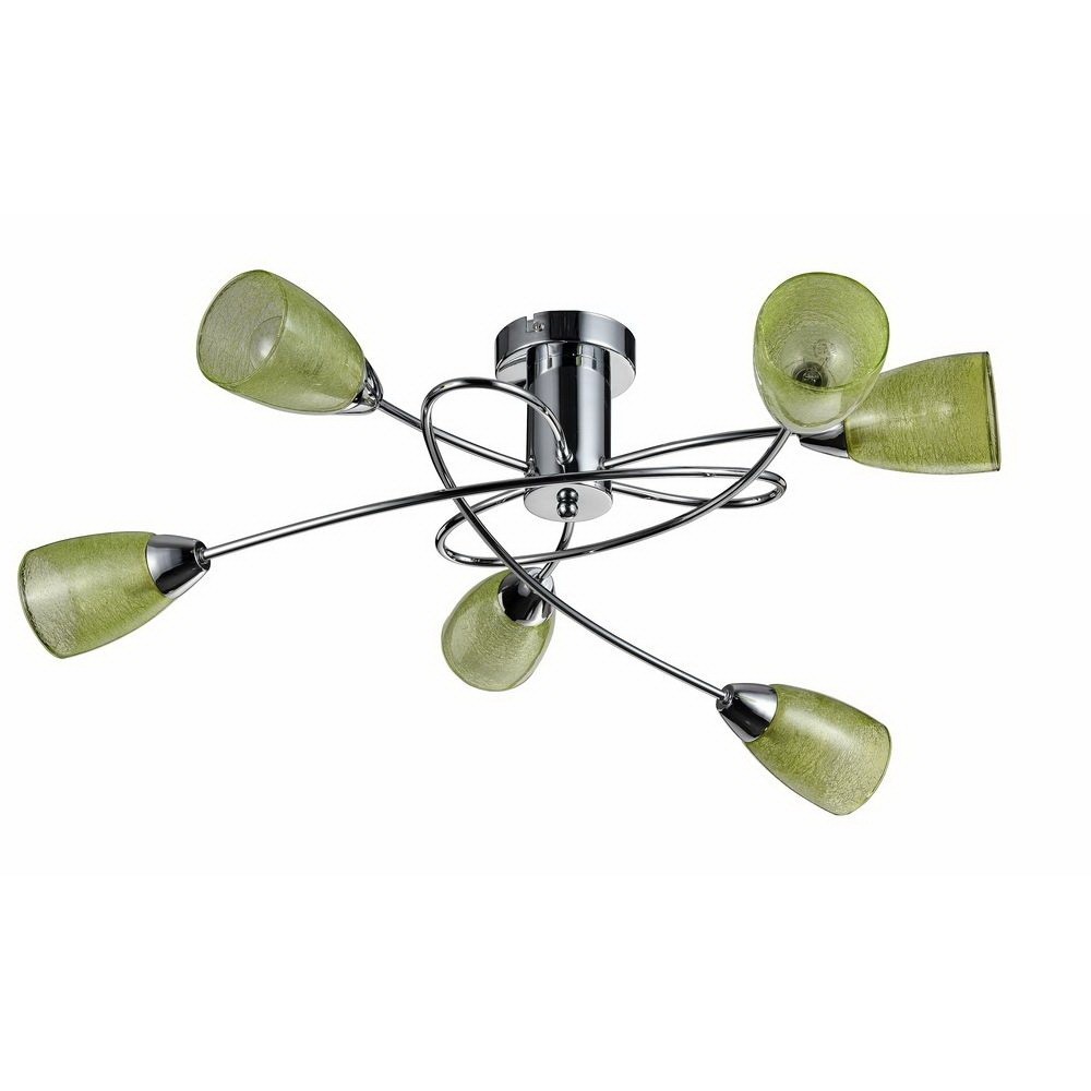 Люстра потолочнаяFR103-06-GN оформлена в современном стиле, выглядит почти воздушной и легко сочетается с другими элементами обстановки. Симпатичные стеклянные плафоны зеленого цвета прекрасно смотрятся с хромированной металлической арматурой. Этот светильник способен создавать освещенную зону площадью в 12 кв. м, поскольку обладает мощностью в 240 Вт. Цоколь лампочек – 6xE14.