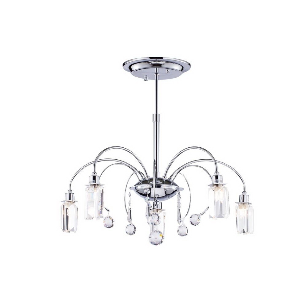 Люстра потолочная FR605-05-N оформлена в современном стиле и легко сочетается с другими элементами обстановки. Симпатичные стеклянные плафоны прозрачного цвета прекрасно смотрятся с хромированной металлической арматурой. Этот светильник способен создавать освещенную зону площадью в 11 кв. м, поскольку обладает мощностью в 200 Вт. Цоколь лампочек – 5xG9.