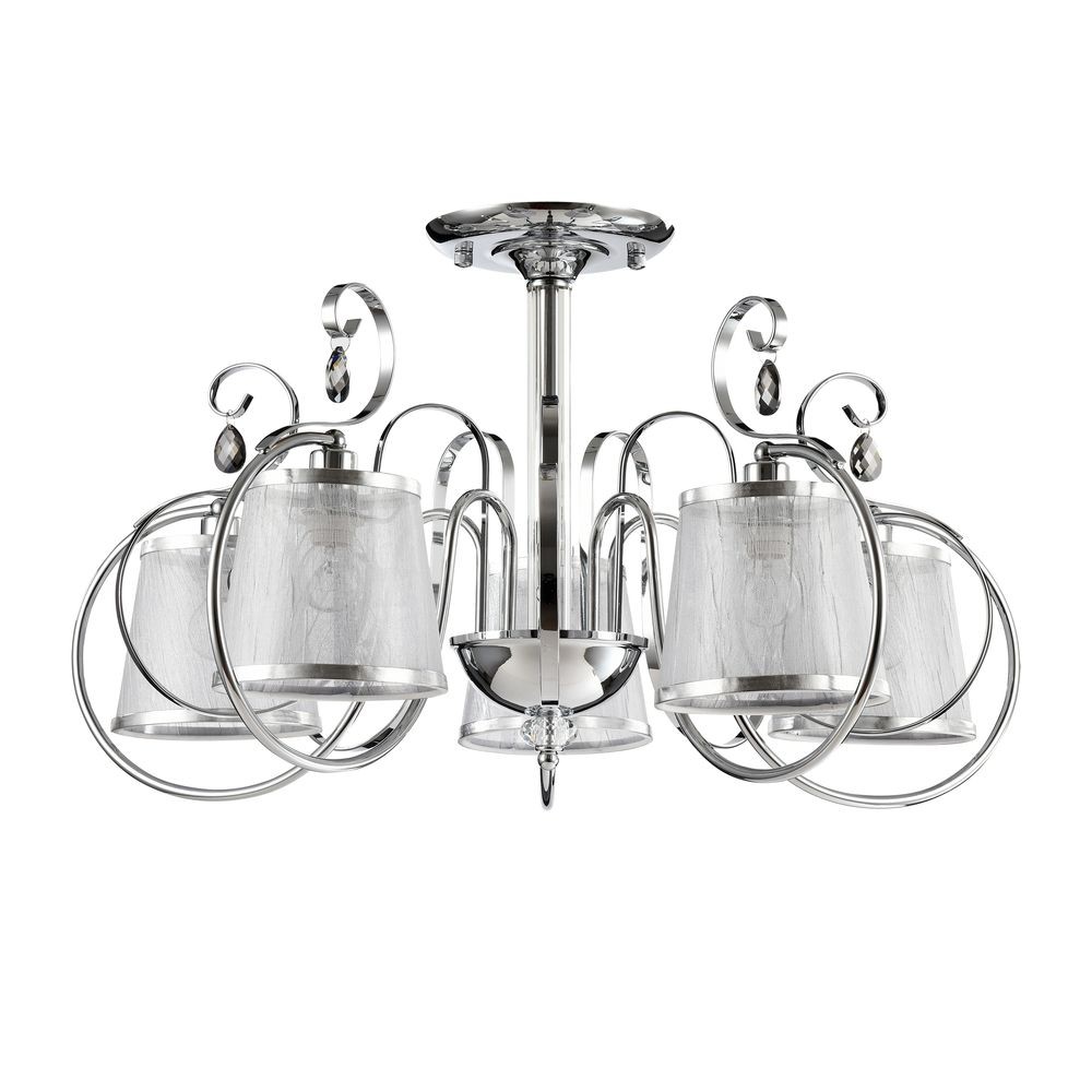 Люстра потолочная FR020-05-N оформлена в стиле арт-деко, данный светильник выглядит почти воздушным и легко сочетается с другими элементами обстановки. Симпатичные тканевые плафоны серого цвета прекрасно смотрятся с хромированной металлической арматурой. Абажур выполнен из органзы, конструкция декорирована подвесками из хрусталя. Этот светильник способен создавать освещенную зону площадью в 10 кв. м, поскольку обладает мощностью в 200 Вт.