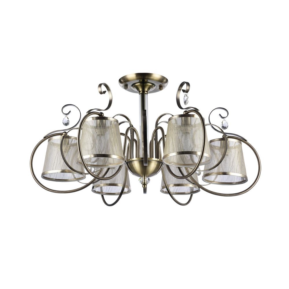 Люстра потолочная FR020-06-R оформлена в стиле арт-деко, данный светильник выглядит почти воздушным и легко сочетается с другими элементами обстановки. Симпатичные тканевые плафоны бежевого цвета прекрасно смотрятся с бронзовой металлической арматурой. Абажур выполнен из органзы, конструкция декорирована подвесками из хрусталя. Этот светильник способен создавать освещенную зону площадью в 12 кв. м, поскольку обладает мощностью в 240 Вт.