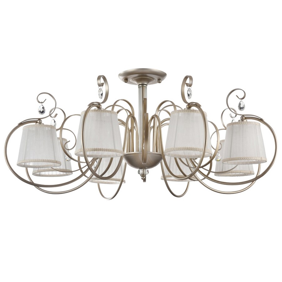 Люстра потолочная FR020-08-G оформлена в стиле арт-деко, данный светильник выглядит почти воздушным и легко сочетается с другими элементами обстановки. Симпатичные тканевые плафоны белого цвета прекрасно смотрятся с латунной металлической арматурой. Абажур выполнен из органзы, конструкция декорирована подвесками из хрусталя. Этот светильник способен создавать освещенную зону площадью в 16 кв. м, поскольку обладает мощностью в 320 Вт.