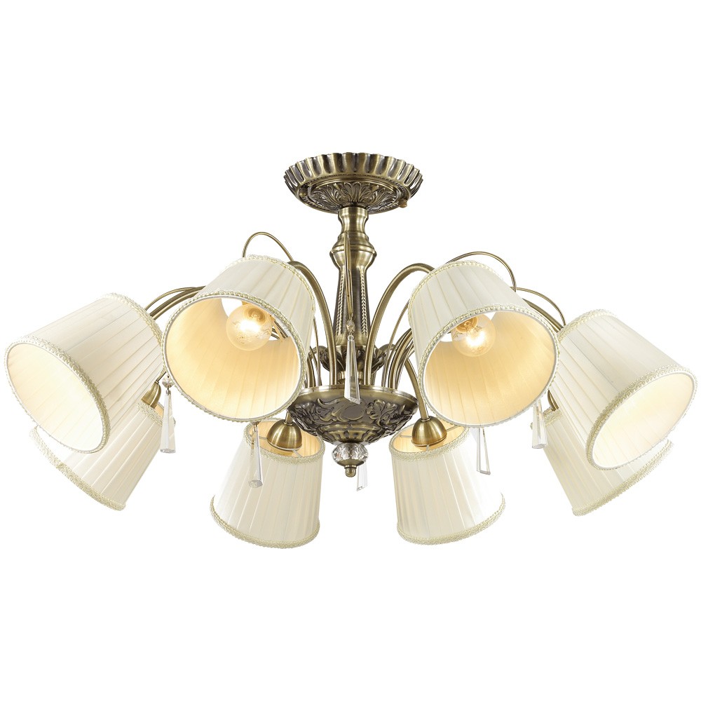 Люстра 2925/8С серии Atesa выполнена в бронзовом цвете. Светлый тканевый абажур потолочной люстры украшен окантовкой из тесмы, декоративные элементы выполнены в виде хрустальных подвесок. Помимо изысканного внешнего оформления, люстра обладает отличной производительностью. При максимальной мощности в 320 Вт она способна создать оптимальное освещение пространства площадью в 16 кв.м.