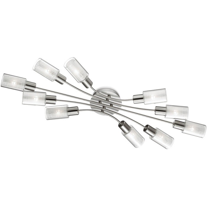 На пяти тонких хромированных прутьях арматуры, веером расходящихся в двух противоположных направлениях, расположены по два небольших плафона. Плафоны имеют форму цилиндра и одеты в двойные наряды. Каждый из них имеет внешний прозрачный плафон и внутренний матово-белый с нанесенными на его поверхность различными геометрическими рисунками в форме квадратов, прямоугольников и других простых фигур.